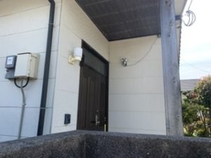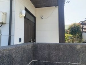 フェンス取付け工事中、玄関柱を木部着色保護塗料で塗装。玄関が引き締って見える。